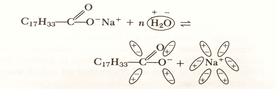 (c) Finally, polar solvents are capable of solvating molecules and ions through dipole interaction forces, particularly hydrogen bond formation, which leads to the solubility of the compound. The solute must be polar in nature because it often must compete for the bonds of the already associated solvent molecules if it is to win a place in the associated structure. The ion-dipole interaction between the sodium salt of oleic acid and water can be depicted as